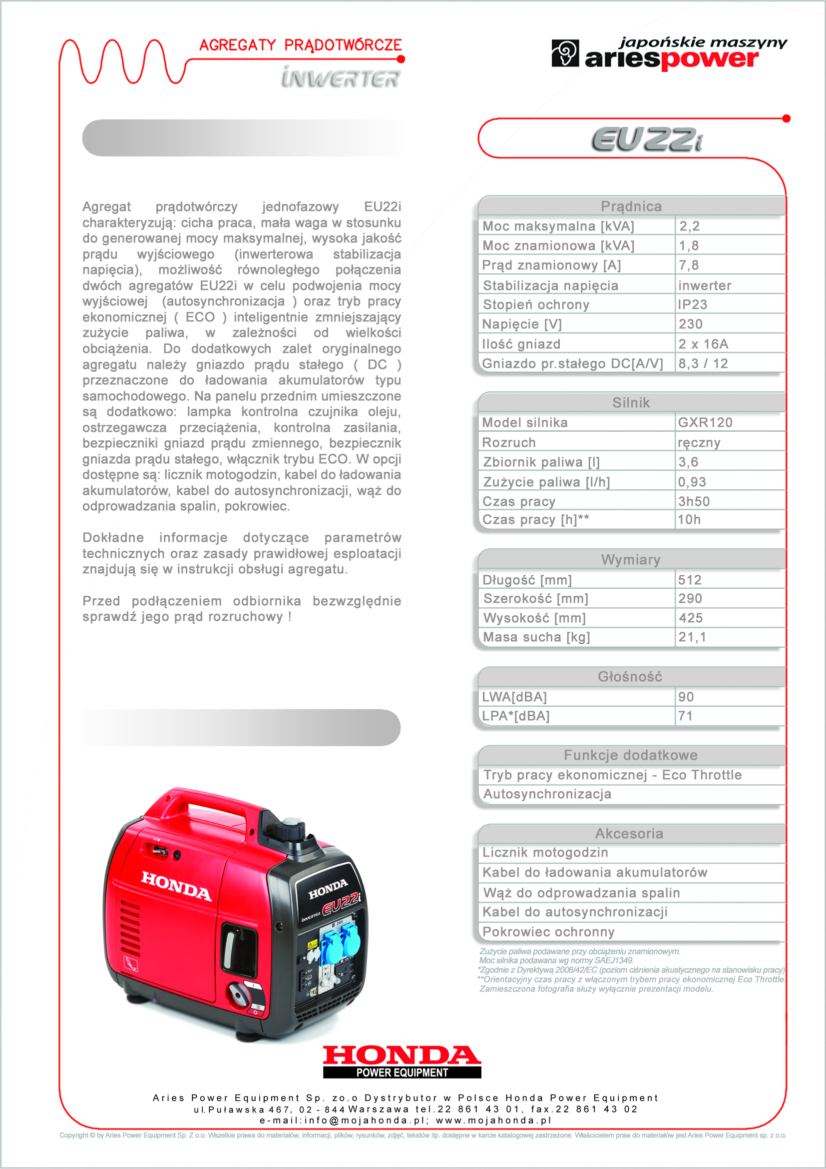 Agregat prądotwórczy jednofazowy Honda model EU22i charakteryzują: cicha praca, mała waga w stosunku do generowanej mocy maksymalnej, wysoka jakość prądu wyjściowego (inwerterowa stabilizacja napięcia), możliwość równoległego połączenia dwóch generatorów EU22i w celu podwojenia mocy wyjściowej (autosynchronizacja) oraz tryb pracy ekonomicznej (ECO) inteligentnie zmniejszający zużycie paliwa, w zależności od wielkości obciążenia.